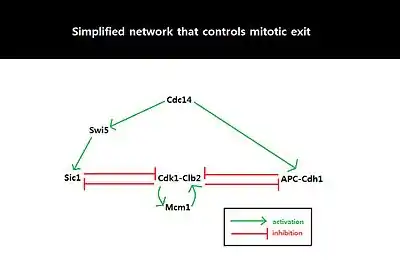 Because the behavior of cell cycle critically depends on the amount of Sic1 at the M-G1 transition state, the amount of Sic1 is tightly regulated by systems-level feedbacks. Because Cdk1-Clb2 inhibits Sic1 by phosphorylating Sic1 and making Sic1 available for degradation via ubiquitylation, APC-Cdh1-dependent degradation of Cdk1-Clb2 not only decreases the level of available Cdk1-Clb2 complexes but also increases the level of Sic1 which in turn further inhibits the function of Cdk1-Clb2.[8] This activation of the double negative feedback loop is initiated from APC-Cdc20-dependent degradation of Cdk1-Clb2 and release of Cdc14 from nucleolar protein Net1/Cfi1.[14] FEAR (Cdc14 early anaphase release) pathway facilitates Clb2-Cdk1-dependent phosphorylation of Net1 which transiently releases Cdc14 from Net1.[15] The released Cdc14 and Clb2-Cdk1 complexes go onto form spindles that activates mitotic exit network (MEN). MEN allows sustained release of Cdc14 from the nucleolus,[15] and Cdc14 counters the activity of Clb2-Cdk1 by activating Cdh1 and stabilizing Sic1 through activation of Sic1-transcriptional activator Swi5.[16] Sic1 positively regulates itself by inhibiting Cdk1-Clb2 to release inhibition of Swi5, and Cdh1 also positively regulates itself by inhibiting Clb2-Cdk1 to release inhibition of MEN which can activate Cdc14 and subsequently Cdh1 itself. The double-negative feedback loop, formed by APC-Cdh1 and Sic1, is required to maintain low Clb2-Cdk1 activity because Clb2 auto-activates its synthesis by activating transcriptional factors, Fkh2–Mcm1 Ndd1 complex.[8]