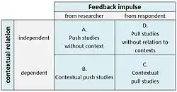 Push studies without contexts (A) are conducted independently from time and location. This can be CATI- or CACI studies as well as surveys by SMS or MMS. In cases of these research methods, the feedback impulse actively comes from the researcher. With contextual push studies (B) the researcher prompts the respondent to give appropriate feedback once it is recognized that he/she is located in a particular environment or is in a certain situation.[10] Pull studies are characterized that participants call in the questionnaire themselves. In many cases, short notes draw attention to a survey or an evaluation. Such communications may be placed in certain contexts (C) (e.g. on receipts, advertisements, or product packaging) to encourage participation. Non-context-sensitive pull studies (D) are not relevant for marketing research since they provide only general feedback, which has no relation to a fixed object of research. Therefore, they are hardly controlled and evaluated.[11]