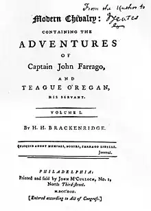 Modern Chivalry: Containing the Adventures of Captain John Farrago and Teague O'Regan, His servant is a rambling, satirical American novel by Hugh Henry Brackenridge, a Pittsburgh writer, lawyer, judge, and justice of the Pennsylvania Supreme Court. The book was first published in 1792.