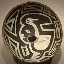 Mimbres bowls are often found associated with burials, typically with a hole punched out of the center, known as kill holes. Bowls with kill holes have been commonly found covering the face of the interred person. However, archaeological evidence suggests that most potteries were not buried with the dead.[19] Wear marks on the insides of bowls show they were actually used, not just produced as burial items. The distinctive style, which includes "diamond-shaped eyes and receding chins for human figures", created demand on the black market beginning in the 1960s, and vandalism and looting of gravesite took pace and has continued into the present day.[20]