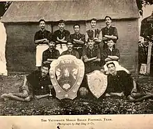 In 1909 and 1910, among only a few other native clubs, the team had the honor to play in the IFA Shield for its consistent performances over the recent years. However, they would struggle to match the regiment teams of British and British Indian armies in the first two years.[12] In 1911, Mohun Bagan formed a dominant side for the IFA Shield,[16] which included Hiralal Mukherjee, Bhuti Sukul, Rev. Sudhir Chatterjee, Monmohun Mukherjee, Rajen Sengupta, Nil Madhav Bhattacharya, Kanu Roy, Habul Sarkar, Abhilash Ghosh, Bijoydas Bhaduri and captained by Shibdas Bhaduri.[17] They battled out against the professionally equipped teams of St. Xavier's College, Calcutta Rangers Club, Rifle Brigade and Middlesex Regiment to reach the IFA Shield final without conceding a goal. The enthusiasm for the final on 29 July 1911 (which is now known as "Mohun Bagan Day") was such that people came from other districts of Bengal as well as from neighboring provinces of Bihar and Assam.[12] The East Indian Railway Company ran a special train and additional steamer services were pressed into service to ferry spectators to Calcutta from the mofussil areas.[12] Tickets for the match, originally priced at ₹1 and ₹2, were sold at ₹15 due to its immense demand in the country.[12] After trailing by a goal from Sgt. Jackson of East Yorkshire Regiment team within the first 15 minutes of the 50 minutes of the match, Shibdas Bhaduri soon scored an equalizer in the first half and then set up Abhilash Ghosh to score the winner with just two minutes remaining of the match.[17][18] The club became the first native team to lift the IFA Shield, that too in front of an estimated crowd of 80,000, although the referee, H.G. Pooler, estimated approximately 20,000 to be the number.[17][19] Reuters in its cablegram to English newspapers mentioned: "For the first time in the history of Indian football an Indian team, the Mohun Bagan, consisting purely of Bengalees, has won the Indian Football Association Shield beating crack teams of English regiments. About 80,000 spectators were present on the ground, but most of them could not see the match. By noticing the flying of kites, they were following the actions of the match. And when they came to know about the win of their team, they started tearing off their shirts, waving them, tearing their hairs."[12][17] The mood can be gauged by what Achintya Kumar Sengupta wrote in Kallol Jug: "Mohun Bagan is not a football team. It is a tortured country, rolling in the dust, which has just started to raise its head."[20] Mohun Bagan supporters and the public at large went berserk, even supporters of Muslim representative clubs like Moslem and Mohammedan went to the streets to celebrate and the Muslims from Dharmatala joined the victory procession of Hindus near the Thanthania Kalibari.[12][21][22] On 31 July 1911, The Englishman wrote, "What the Congress failed to achieve, Mohun Bagan has. In other words, they have succeeded in degrading the English." The performance was appreciated by Manchester Guardian saying, "The team comprisingof the Bengalis won the IFA Shield by defeating three top military teams. 80,000 Indians will remain witnesses to this event. There is nothing to be surprised at. The team that is physically more fit, has sharp surveillance and intelligence, wins.".[17] On 30 July 1911, India Mirror reported, "The Japanese victory over the Russians did not stir the East half as much as did the match between Mohun Bagan and East York."[23] After the match ended, a Brahmin, pointing to the Union Jack fluttering atop Fort William, asked Rev. Chatterjee, "When will that come down?" and according to popular legend, it was predicted that the flag would come down only when Mohun Bagan regained the shield, which would later come true.[21]