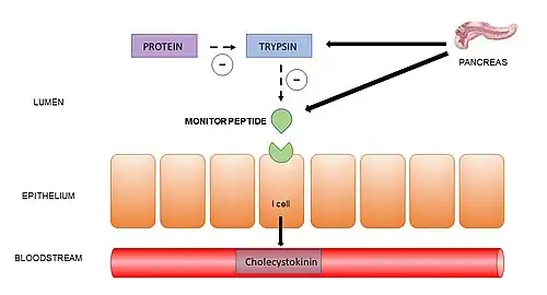 Its role as a feedback regulator has been well-described for decades.[5] Monitor peptide binds to intestinal epithelial cells and induces CCK-release, which enhances pancreatic secretion in the presence of nutritional protein in the duodenum.[5] When all nutritional protein is digested, monitor peptide is bound by trypsin and subsequently degraded, resulting in decreasing CCK-release and a reduction of pancreatic secretion.[5]