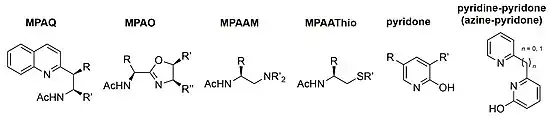 Since the initial MPAA ligand report, many variations of bifunctional ligands derived from amino acids have been developed. Bidentate MPAQ (mono-protected amino quinoline) ligands were introduced in the application of β-methylene C–H bonds in aliphatic amides.[14] The highly successful MPAO (mono-protected amino oxazoline) ligand allowed for C(sp3)–H functionalization via arylation of α-methyls, borylation of cyclobutyl carboxylic amides, and boronic cross coupling of alkyl amines.[15][16][17][18] MPAAM (mono-protected aminoalkyl amine) ligands were used in enantioselective C(sp3)–H arylations of free aliphatic acids without the need for exogenous directing groups.[19] Variations of the MPAAThio (mono-protected aminoalkyl thioether) ligands have been use in olefination of free carboxylic acids and arylation, carbonylation, and olefination of free aliphatic amines.[20][21]