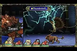In combat, each Jewel Summoner can bring out one monster at a time. Every turn, each monster (both enemy and ally) can activate one attack or elemental ability.[3] Each monster initially has four slots available for abilities. Monsters can quickly learn abilities of their own element type, but can also pick up abilities from other elements.[5] A fire dragon, for instance, can learn snow-based attacks.[6] Using an ability requires the expenditure of a monster's "Jewel Points", a mana-like energy of which each creature has only a finite amount. When a monster's Jewel Points are depleted, it becomes inaccessible to the character and another monster must be selected to fight.[5] Monsters can return to battle when their Jewel Points have been restored at a save point.[6]
