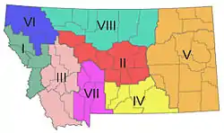 District V (Glendive) – Carter, Custer, Daniels, Dawson, Fallon, Garfield, McCone, Powder River, Prairie, Richland, Roosevelt, Rosebud, Sheridan, Treasure, Valley, and Wibaux counties
