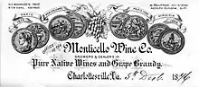 The success of Monticello Wine Company brought Charlottesville to declare itself "the Capital of the Wine Belt in Virginia."[1] The company was best known for its Virginia Claret Wine, produced with Norton grapes—it "won a major international award in 1873 at the Vienna Exposition."[6] It was located in what is now the Monticello American Viticultural Area.[7]
