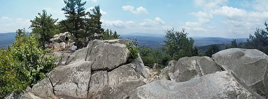 Monument Mountain is the name of a popular 503-acre (204 ha) open space reservation located in Great Barrington, Massachusetts on the southeast side of Monument Mountain. The reservation is centered on the 1,642 feet (500 m) subordinate summit of Peeskawso Peak. It is managed by The Trustees of Reservations, a non-profit conservation organization and is notable for its expansive views of the Housatonic River Valley, the Berkshires, the Taconic Mountains, and the Catskill Mountains of New York from the knife-edge summit of Peeskawso Peak.[1] Monument Mountain, composed of erosion resistant quartzite, is of The Berkshires geology. The reservation receives more than 20,000 visitors a year. The mountain was logged for charcoal to fuel a furnace in Vandusenville at the corner of Division Street and Route 41 in Great Barrington. Remnants of the furnace can be seen if one stands on the Route 41 bridge and looks upstream on the Williams River.
