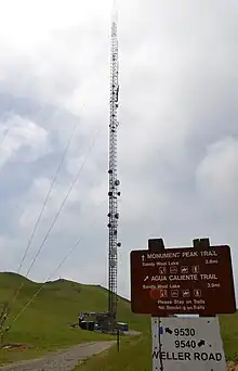 Built on July 1, 1988, an antenna on Monument Peak broadcasts channels 36 (KICU) and 54 (PBS, KQEH) until January 17, 2018. It is a free-standing structure 605.2 feet (184.5 meters) above ground level.[2] In the image above, the Monument Peak antenna is the tallest one seen (far right). The peak is the point directly right of the antenna. The antenna to the far left is on Mount Allison.