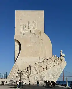 The monument was conceived in 1939 by Portuguese architect José Ângelo Cottinelli Telmo, and sculptor Leopoldo de Almeida, as a temporary beacon during the Portuguese World Exhibition opening in June 1940.[1] The Monument to the Discoveries represented a romanticized idealization of the Portuguese exploration that was typical of the Estado Novo regime of António de Oliveira Salazar. It was originally constructed as a temporary construction, located in the Praça do Império as part of an urban renewal project favoured by minister Duarte Pacheco, but with the resistance of Cottinelli Telmo.[1] Yet, by June 1943, the original structure was demolished after the exposition as there was no concrete formalization of the project.[1][2]