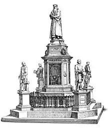 In 1834, references are found to a "noble and highly cultured fellow citizen of ours" from Milan who intended to create a bronze monument to Leonardo at his own expense.[1] The anonymous person had also obtained permission from the Austrian government to place the monument in Brera's courtyard,[2] decorating the access to the double staircase. Monuments to Cesare Beccaria and Giuseppe Parini were also being prepared for the Richinian staircase at the time.