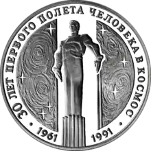 The monument to Yuri Gagarin is depicted on the reverse side of a non-circulating 1 oz silver 3 rouble coin. This coin was minted in 1991 to honor the 30th anniversary of human spaceflight. An image of the monument is depicted on the back side of the coin, along with the words (in Russian) "30 years of human spaceflight". [6]