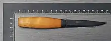 A mora knife (Swedish: Morakniv) is a small sheath knife. It is a fixed blade knife, with or without a finger guard. The term originates from knives manufactured by the cutleries in Mora, Dalarna.[1] In Sweden and Finland, Mora knives are extensively used in construction and in industry as general-purpose tools. Mora knives are also used by all Scandinavian armies as an everyday knife.[2]