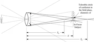 Illustration of von Rohr's method for constructing front and near DOF limits from the outside-the-box parameters, aperture diameter d and angular circle of confusion limit e.