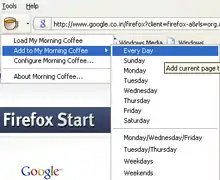 Morning Coffee is a discontinued Firefox addon that assists its Firefox user in opening daily routine websites. Users can configure Morning Coffee with several presets, each of which consists of a collection of URLs. These presets are named after days of the week. Upon order, Morning Coffee can open all URLs within a certain preset in separate tabs. The same effect can be achieved by Firefox bookmarking system, and the ability to open multiple web pages as home pages. However, Morning Coffee can be configured to close all tabs before opening a preset, or randomize the order of the tabs. Morning Coffee's ability to open the correct daily preset instead of home pages remained in the experimental stage.[4][5][6]