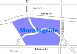 Morningside, also known as Seven Oaks, is a suburban neighbourhood in the city of Toronto, Ontario, Canada. It is located to the north-east of downtown Toronto, in the suburb of Scarborough. Morningside is bordered by Highway 401 to the north, Morningside Avenue to the east, West Highland Creek and Lawrence Avenue to the south and Scarborough Golf Club Road to the west.