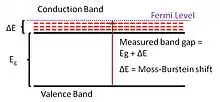 The Moss-Burstein effect, also known as the Burstein–Moss shift, is the phenomenon in which the apparent band gap of a semiconductor is increased as the absorption edge is pushed to higher energies as a result of some states close to the conduction band being populated. This is observed for a degenerate electron distribution such as that found in some degenerate semiconductors and is known as a Moss–Burstein shift.[1][2]