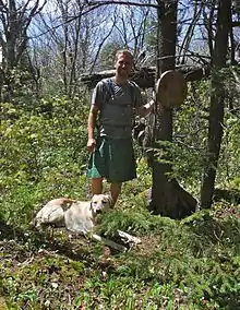 Mount Fitch is the third-highest peak[1] in the Commonwealth of Massachusetts at 3,110 feet (950 m). It is located on the ridge between Mount Greylock at 3,491 feet (1,064 m) to its south and Mount Williams at 2,956 feet (901 m) to its north. The peak sits in the northwest corner of the Town of Adams (originally known as the Town of East Hoosac[2]) in Berkshire County. The forested summit is approximately 123 yards (112 m) due west of a local high-point on the Appalachian Trail. Mount Fitch does not meet the Appalachian Mountain Club's prominence criterion of 200 vertical feet of separation from adjacent peaks as outlined in New England's Four-thousand footers list. Currently there is no side-spur trail or signage directing a hiker to the summit of Mt. Fitch from the Appalachian Trail; however, there is a wooden placard at the summit itself (pictured at right). The top is infrequently visited by hikers due to its anonymity, the bushwhack necessary to reach the top and the viewless summit.