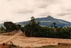 Southwest of Mount Popa is Taung Kalat (pedestal hill), a sheer-sided volcanic plug, which rises 657 metres (2,156 ft) above the sea level. A Buddhist monastery is located at the summit of Taung Kalat. At one time, the Buddhist hermit U Khandi maintained the stairway of 777 steps to the summit of Taung Kalat.[3] The Taung Kalat pedestal hill is sometimes itself called Mount Popa and given that Mount Popa is the name of the actual volcano that caused the creation of the volcanic plug, to avoid confusion, the volcano (with its crater blown open on one side) is generally called Taung Ma-gyi (mother hill). The volcanic crater itself is a mile in diameter.[13]