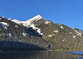 Mount Webb is set 5 km (3.1 mi) north of the Canada–United States border and is within Sx̱ótsaqel/Chilliwack Lake Provincial Park. This peak is situated immediately west of Chilliwack Lake, and 2.6 km (1.6 mi) north of Mount Lindeman.[6] Mount Webb is more notable for its steep rise above local terrain than for its absolute elevation. Topographic relief is significant as the summit rises 1,560 meters (5,120 feet) above Chilliwack Lake in two kilometers (1.2 miles). Precipitation runoff from this mountain drains east into the lake and west into Radium Creek which are both within the Chilliwack River watershed. The nearest higher neighbor is Macdonald Peak, 1.6 km (1 mi) to the south.[1]