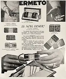 A Movado Ermeto watch was a pocket/purse watch manufactured between 1926 and 1985 by Movado in La Chaux-de-Fonds (Switzerland).[1] The model, a joint creation between case maker Huguenin Frères and watch maker Movado, was introduced in 1926. It won the Grand Prix at the 1929 Barcelona International Exposition.[1]