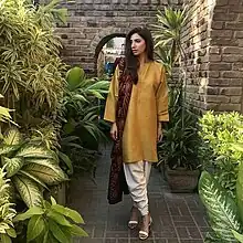 The traditional clothing of Muhajirs is the traditional clothing worn by Muslims in North India, and it has both Muslim and South Asian influences. Both Muslim men and women wear the shalwar kameez as a daily dress,[45] and kurta, pyjama and brightly-coloured waistcoats for special occasions.[46] Other traditional dresses for muhajirs include the sherwani, which is believed to have been introduced to Pakistan by Muhajirs,[47] sari, which is an un-stitched stretch of woven fabric arranged over the body like a robe[48][49] and Gharara which originated from the Nawabs' attempt to imitate the British evening gown.[50]