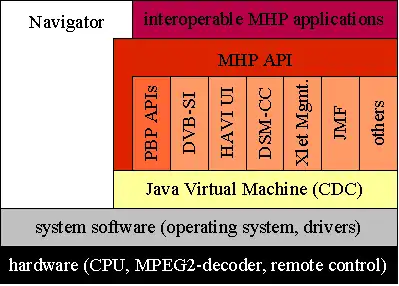 The MHP specifies an extensive application execution environment for digital interactive TV, independent of the underlying, vendor-specific, hardware and software. This execution environment is based on the use of a Java virtual machine and the definition of generic APIs that provide access to the interactive digital TV terminal's typical resources and facilities. The interoperable MHP applications are running on top of these APIs. A so-called Navigator-application, which is part of the terminal software, allows the user the access to all MHP applications and other DVB services (like TV and radio). Sometimes Navigator can be also a Java program itself but that is not a requirement.