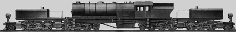 Beyer, Peacock and Company also applied for a patent for a quadruplex locomotive in 1927. Based on their successful Garratt locomotive design, it was called the Super-Garratt. The standard gauge locomotive was designed as an articulated 2-6-6-2+2-6-6-2 for the North American railroads and would have been built in conjunction with the American Locomotive Company (ALCo).[14] The starting tractive force of 200,000 pounds-force (890 kN) of the 460-ton locomotive would probably have been at the limit of the couplers in use at the time. Like a Garratt locomotive, it had a centre frame with boiler, firebox and cab, which sat on two subframes at each end. Each subframe, like a Mallett locomotive, contained a fixed set of driving wheels and, at the end of the locomotive, a pivoting bogie with another set of driving wheels. In addition to the standard gauge version, a 3 ft 6 in gauge version was planned for the South African Railways (SAR), but neither version was built.[15][16]