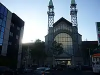The original iron and glass[9] building is in the Jugendstil-style. It measures 1,500 square metres (16,000 sq ft) in size with towers which rise 47 metres (154 ft). The varnished roof is of natural pine; it is treated with synthetic rubber for waterproofing.