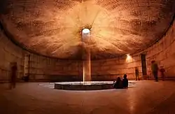 The underground museum is part of a master plan that includes a multimedia projection theater, an amphitheater, three water pools, Shikha Chirantony (eternal flame) symbolizing the eternity of Bengali nationalism, a mural based on the struggle for independence and other ancillary facilities.[2] There is also a 155-seat auditorium in the complex.[3] The focal point in the experience of the space is the monument, Tower of Light which is a 50-meter high tower composed of stacked glass panels.[3] The museum is situated beneath the tower of light.[4] The museum's plaza area has a 5669 square meter of tiled floor.[4] Its underground terrace has a fountain at the center where water is falls from over the ceiling. Bangladeshi architects Kashef Mahboob Chowdhury and Marina Tabassum won a national design competition in 1997 and subsequently they were commissioned for the project.[5] The total construction cost of the complex was 1.75 billion tk.[6][7]
