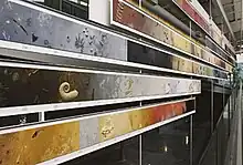 Rock of Ages, Sands of Time is a series of 544 mural paintings by artist Barbara Page. Each of the 544 11✕11" masonite tiles represents 1 million years, encompassing the last 544 million years of history, from the Cambrian Explosion to the present day. Each tile features life-size images of fossils from its respective interval of time, both two-dimensional and in low bas-relief, displayed on a background representing the common rocks and sediments of the time.[4]: 89 The images are based on actual specimens from PRI's collections. The entire mural is approximately 500 feet long and is displayed along a ramp leading visitors from the lobby to the lower-level exhibits.[9] A book contains reproductions of each painting and describes their scientific context in detail.[10]