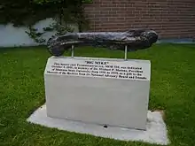 Bronze cast of "Big Mike" (T. rex) femur in front of the MOR building.