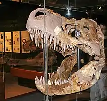 Apart from housing one of the largest collections of dinosaur fossils in the world and the largest in the United States,[14] the museum is also home to one of the world's largest Tyrannosaurus skulls (MOR 008) narrowly surpassing that of the Chicago Field Museum's specimen, Sue.[15] The museum's Siebel Dinosaur Complex is home to one of the first identified female dinosaurs, an ovulating T. rex.[1] Curator Horner, who served as an adviser to the Jurassic Park films,[14][16] was one of the lead scientists involved in the 2005 discovery of soft tissue remains in the thigh bone of a Tyrannosaurus,[17] which were later brought to the museum. The museum has also been involved in a number of other finds, including a baby Triceratops in Jordan, Montana, in 2006,[18] and "Yoshi's Trike" (MOR 3027), a large Triceratops specimen with 125 cm long horns, discovered in 2010.[19]