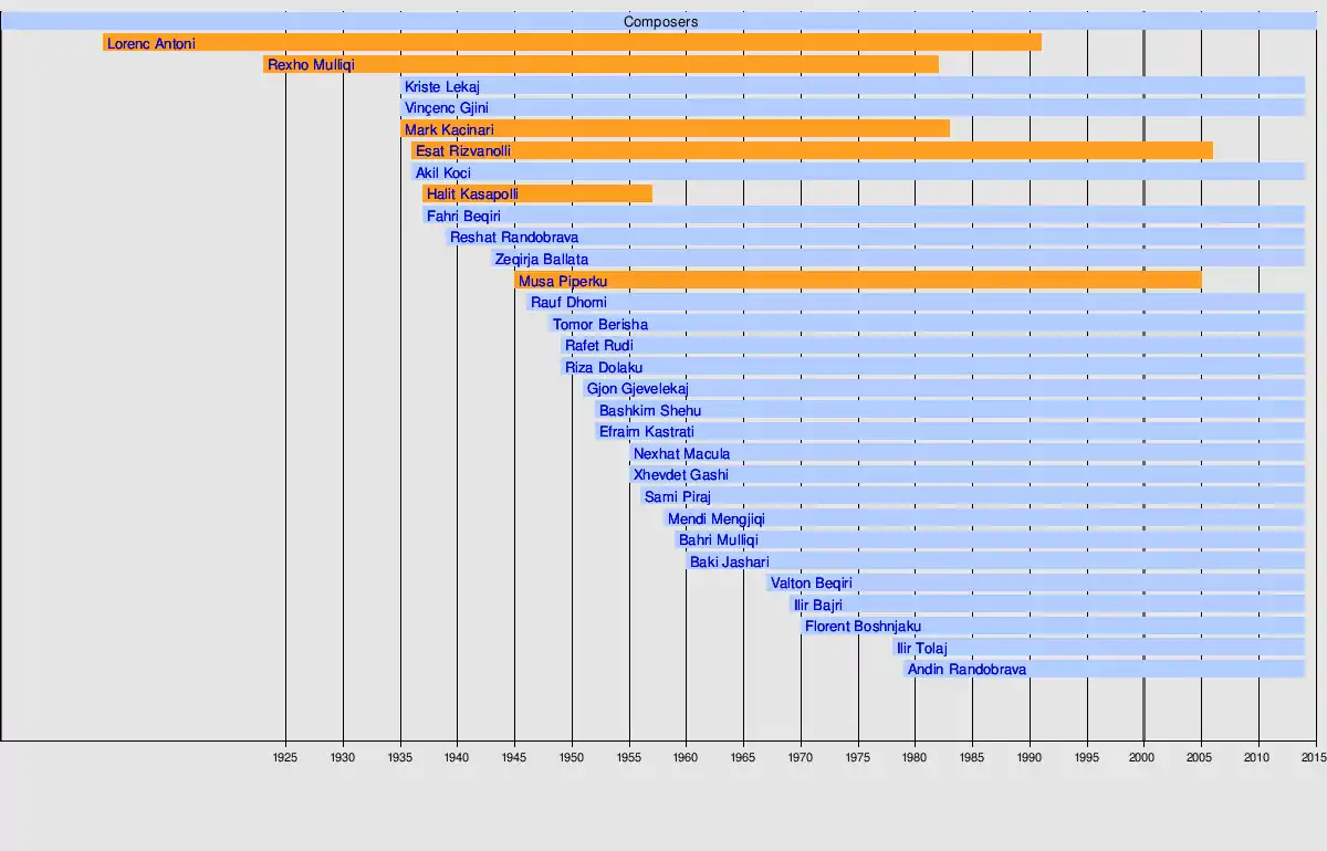 The most important Association was the one of Composers which besides the gatherings of musicians and artists, organized a number of other music related activities. This association was the founder of the festival "Ditet e Muzikes Kosovare" (The Days of Kosovan Music) which was organized from 1979 to 1992. The Music Activities an interruption from 1990 to 1999 due to political circumstances. The activity of Kosovan composers had its development in and outside Kosovo.[11] Even though small in numbers of composers the creativity level was on a high level.[12]