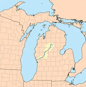 The Muskegon River (/məˈskɡən/ mə-SKEE-gən) is a river in the western portion of the lower peninsula of the U.S. state of Michigan. The river source is located at Houghton Lake in Roscommon County, flowing out of the North Bay into neighboring Missaukee County. The river passes through Clare County, Osceola County, Mecosta County, Newaygo County, and Muskegon County, and generally flows southwesterly to its mouth at Muskegon, Michigan, where it empties into Muskegon Lake. Muskegon Lake is connected to Lake Michigan via a mile-long channel. The river has several major branches, such as the Hersey River, Cedar Creek and Little Muskegon River. The primary river channel is 216 miles (348 km) long[1] and drains an area of 2,350 square miles (6,100 km2).[2] In September 2002, an article in National Geographic raised concerns about a controversial deal made with Nestlé Waters North America, giving them permission "to bottle up to 210 million gallons (about 800 million liters) a year from an aquifer north of Grand Rapids, Michigan that recharges the Muskegon River".[3]
