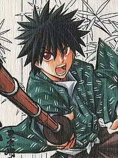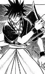 Yahiko starts off as arrogant and bad-mannered; he had already bestowed upon himself the title "Tokyo Samurai", as his father was a samurai who died during the Battle of Ueno in the Boshin War, slain at the Keneiji Temple.[10] Because Yahiko respected his parents, he becomes a thief before the start of the series, to pay back their debt. Yahiko first appears trying to rob Kenshin, who stops him but lets him go. As his yakuza bosses are about to beat him to death for his desire to quit, Kenshin arrives to save him and take him to Kaoru's dojo to learn swordsmanship.[10] Yahiko's dream is to be as strong as Kenshin so he will be able to protect himself and the people he loves.[11] Despite his young age and his short time of training, as the series continues Kenshin allows Yahiko to fight with him, noting that he is too mature for his age.[12] He becomes a witness to many of Kenshin's later battles[13] to the point which Yahiko becomes adept at imitating some of Kenshin's Hiten Mitsurugi-ryū (飛天御剣流, lit. "Flying Heaven Honorable Sword Style") techniques, combining them to perform many other powerful sword techniques.[14][15] Yahiko also learns the principles of Kamiya Kasshin-ryū (神谷活心流, lit. "Gods' Valley Alive Heart Style"), which matches Kenshin's ideal of saving lives. When Kenshin goes to Kyoto to fight Shishio Makoto who wanted to conquer Japan, Yahiko accompanies Kaoru to find and aid Kenshin.[16] While Kenshin goes to have his final fight against Shishio, he stays in Kyoto to defend their base, a hotel named Aoi-ya, from Shishio's forces along with Kaoru and the Oniwabanshū.[17] They are successful in doing it, and Yahiko manages to defeat one of Shishio's strongest soldiers, Henya.[14]