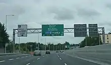 In July 2009, an upgrade of the section between the M50 junction and the Leixlip interchange was completed. In this section the road is three lanes in each direction, the median crossings were removed and the junction with the R120 is a fully grade-separated junction. Private accesses and some left turns remain which prevents the section from being designated a motorway. The speed limit is 80 km/h.[8] There are currently no signal-controlled junctions on the N/M4 between the M50 motorway and the Sligo through-pass.