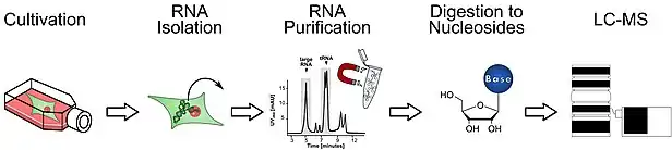 In general, cells are cultivated in unlabeled or stable (non-radioactive) isotope labeled media. For example, the medium can contain glucose labeled with six carbon-13 atoms (13C) instead of the normal carbon-12 (12C). Cells growing in this medium, will, depending on model organism, incorporate the heavy glucose into all of their RNA molecules. Thereafter, all nucleotides are 5 Da heavier than their unlabeled isotopologues due to a complete carbon labeling of the ribose. After cultivation and appropriate labeling of the cells, they are generally harvested using phenol/chloroform/guanidinium isothiocyanate. Other extraction methods are possible and sometimes needed (e.g. for yeast). RNA is then isolated by Phenol-Chloroform extraction and iso-Propanol precipitation. Further purification of specific RNA species (e.g. rRNA, tRNA) is usually done by size-exclusion chromatography (SEC) but other approaches are available as well. For most applications the final product needs to be enzymatically digested to nucleosides before analysis by LC-MS. Therefore, digestion enzymes such as benzonase, NP1 and CIP are used.[5][6] Typically, a triple quadrupole in MRM mode is used for the measurements.