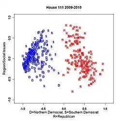 NOMINATE (an acronym for Nominal Three-Step Estimation) is a multidimensional scaling application developed by US political scientists Keith T. Poole and Howard Rosenthal in the early 1980s to analyze preferential and choice data, such as legislative roll-call voting behavior.[1][2] In its most well-known application, members of the US Congress are placed on a two-dimensional map, with politicians who are ideologically similar (i.e. who often vote the same) being close together. One of these two dimensions corresponds to the familiar left–right political spectrum (liberal–conservative in the United States).