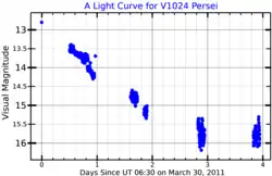 ![]() A visual band light curve for the 2011 eruption of V1024 Persei, adapted from Osborne et al. (2011)[1] | |