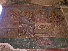 Church wall-painting was done in 1412–1431, stylistically it belongs to the wider circle of the Byzantine art.[1] Some compositions are relocated at the Art Museum of Georgia. The painting on the separating wall of the hall and after is with three registers: the argus – eye represented in the top register, Abraham's hospitability in the second, and church fathers and Svimeon Mesvete in the third.