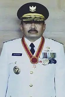 On 22 May 1993, Nuriana was sworn in as the governor of West Java after his election by the provincial council with 68 of 99 votes. At that time, he held the rank of major general.[4] When he ran for reelection in 1998, the Reformasi movement was in full swing, and his candidacy was challenged with sixteen potential gubernatorial candidates (Nuriana included) running for the office.[5][6] Despite this, Nuriana still managed to win reelection with 70 out of 96 votes.[5] He was sworn in for his second term on 8 August 1998.[7]