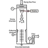 The drying gas enters the system via the heater. A new kind of heater system allows for laminar air flow. The spray head sprays the fine droplets with a narrow size distribution into the drying chamber. The droplets dry and become solid particles. The solid particles are separated in the electrostatic particle collector. The [exhaust gas] is filtered and sent to a fume hood or the environment. The inlet temperature is controlled by a temperature sensor. and can be very dangerous also due to particulate matter