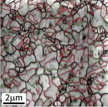 A nanostructured film is a film resulting from engineering of nanoscale features, such as dislocations, grain boundaries, defects, or twinning. In contrast to other nanostructures, such as nanoparticles, the film itself may be up to several microns thick, but possesses a large concentration of nanoscale features homogeneously distributed throughout the film. Like other nanomaterials, nanostructured films have sparked much interest as they possess unique properties not found in bulk, non-nanostructured material of the same composition. In particular, nanostructured films have been the subject of recent research due to their superior mechanical properties, including strength, hardness, and corrosion resistance compared to regular films of the same material.[1] Examples of nanostructured films include those produced by grain boundary engineering, such as nano-twinned ultra-fine grain copper, or dual phase nanostructuring, such as crystalline metal and amorphous metallic glass nanocomposites.[2]
