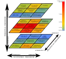 The gameplay is centered on the player deciding government policies through "issues". Issues are written by either Barry or by the players themselves with moderator editing[6][13] and are based on real-world politics with an "absurd and humorous direction".[12] The player may choose from a list of options or dismiss the issue, and the player's responses may affect the nation's status across three main statistics: political freedom, civil rights, and economy; based on these main statuses, the nation is assigned to one of twenty-seven government classifications[6] which are determined on a three-axis scale of personal, economic, and political freedom. When NationStates initially launched, players received only one issue per day, however, players now receive issues multiple times per day on timed intervals.[12]