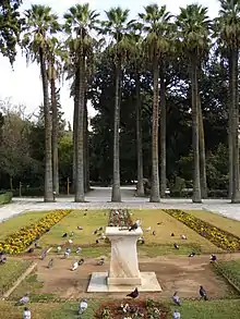 The National Garden[1][2] (Greek: Εθνικός Κήπος), called the Royal Garden until 1974,[3] is a public park of 15.5 hectares (38 acres) in the center of the Greek capital, Athens. It is located between the districts of Kolonaki and Pangrati, directly behind the Greek Parliament building (The Old Palace) and continues to the South to the area where the Zappeion is located, across from the Panathenaiko or Kalimarmaro Olympic Stadium of the 1896 Olympic Games. The Garden also encloses some ancient ruins, column drums and Corinthian capitals of columns, mosaics, and other features. On the Southeast side are the busts of Ioannis Kapodistrias, the first governor of Greece, and of the Philhellene Jean-Gabriel Eynard. On the South side are the busts of the celebrated Greek poets Dionysios Solomos, author of the Greek National Hymn, and Aristotelis Valaoritis.