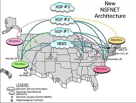 - ↑ NSF Solicitation 93-52 Archived 2016-03-05 at the Wayback Machine - Network Access Point Manager, Routing Arbiter, Regional Network Providers, and Very High Speed Backbone Network Services Provider for NSFNET and the NREN(SM) Program, May 6, 1993