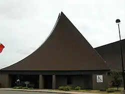 Side view of building shows its ski jump shape