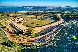 The advanced Eshkol Water Filtration Plant, completed in 2007-2008 by Mekorot,[8] the fourth largest in the world,[9] is located at the southwestern edge of the Beit Netofa Valley. The water first passes through two large reservoirs. The first of these is a sedimentation pond, holding about 1.5 million m³ of water, which allow suspended matter in the water to settle to the bottom, thus cleaning the water. The second reservoir is separated from the sedimentation pond by a dam and has a capacity of 4.5 million m³. Here the inflow of water from the pumping stations and open canals is regulated against the outflow into the closed pipeline. The amount allowed through depends on water demand. A special canal bypasses the reservoirs allowing water to travel straight through the carrier.[1] Before entering the closed pipeline, final tests are performed on the water in the carrier, with chemicals added to bring the water to drinking standards. At the end of the filtration process the water enters the 108" Pipeline, which transports it 86 km to the Yarkon-Negev system near the city of Rosh HaAyin to the east of Tel Aviv and Petah Tikva.[1]
