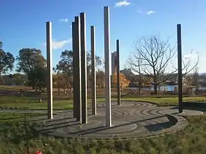 The memorial consists of eight tall stone poles, symbolically sighted across a stylised map of Australia in the places of the state and territory capital cities. Architectural firm Johnson Pilton Walker[5] has placed concentric circles around the poles with words representing the intended outcome of knowledge and application of good practices of work health and safety.