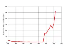 Historically, Israel relied on external imports for meeting most of its energy needs, spending an amount equivalent to over 5% of its GDP per year in 2009 on imports of energy products.[3] The transportation sector relies mainly on gasoline and diesel fuel, while the majority of electricity production is generated using imported coal. As of 2013, Israel was importing about 100 million barrels of oil per year.[4] The country possesses negligible reserves of crude oil but does have abundant domestic natural gas resources which were discovered in large quantities starting in 2009, after many decades of previously unsuccessful exploration.[5][6][7][8][9]
